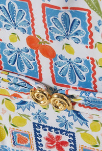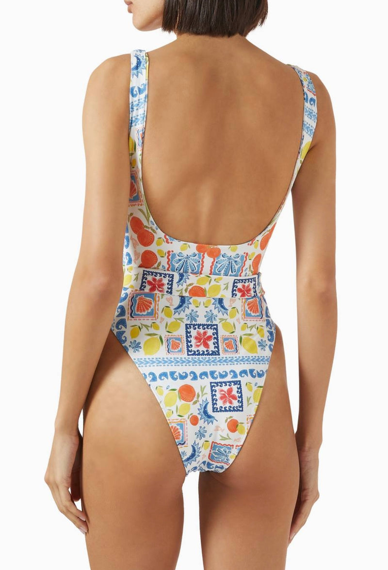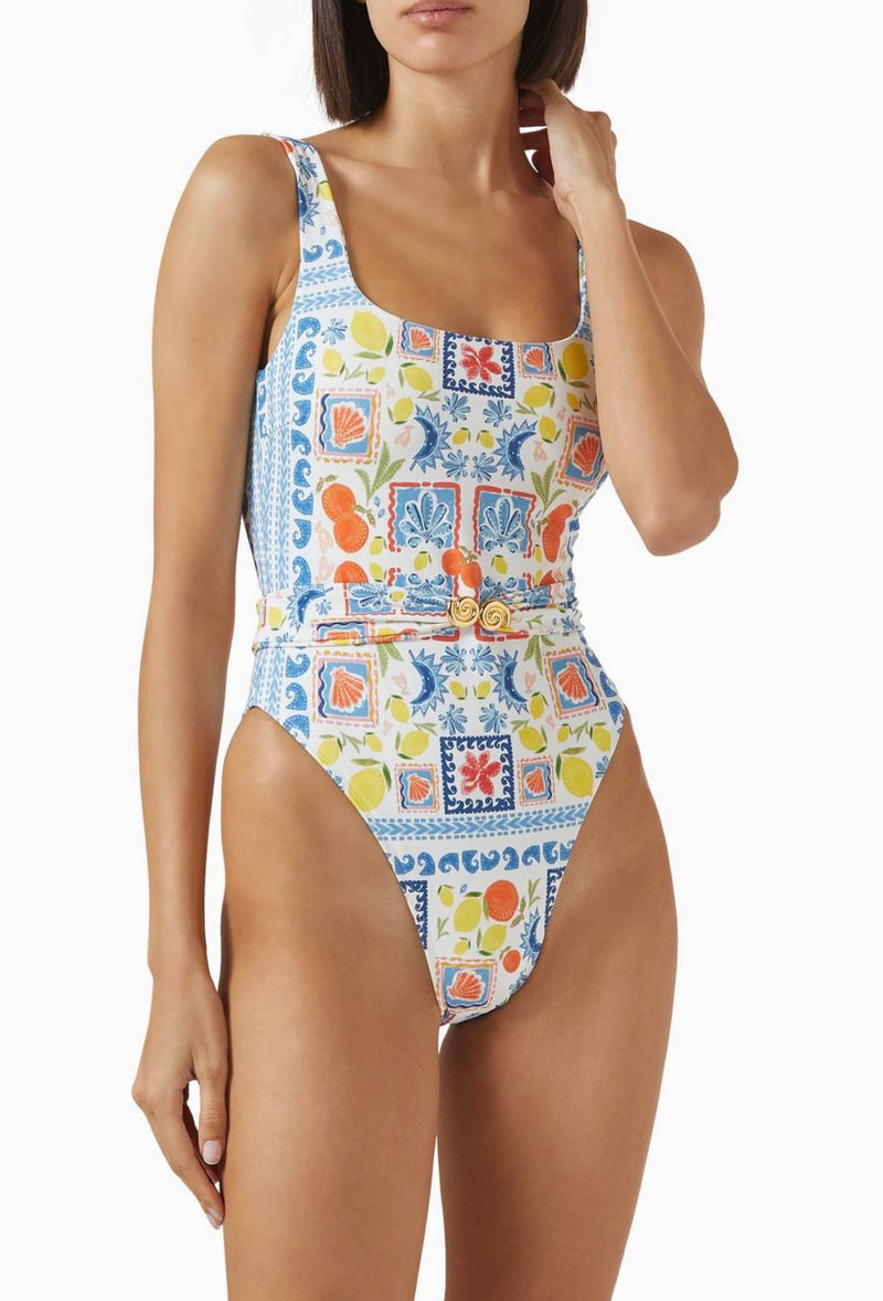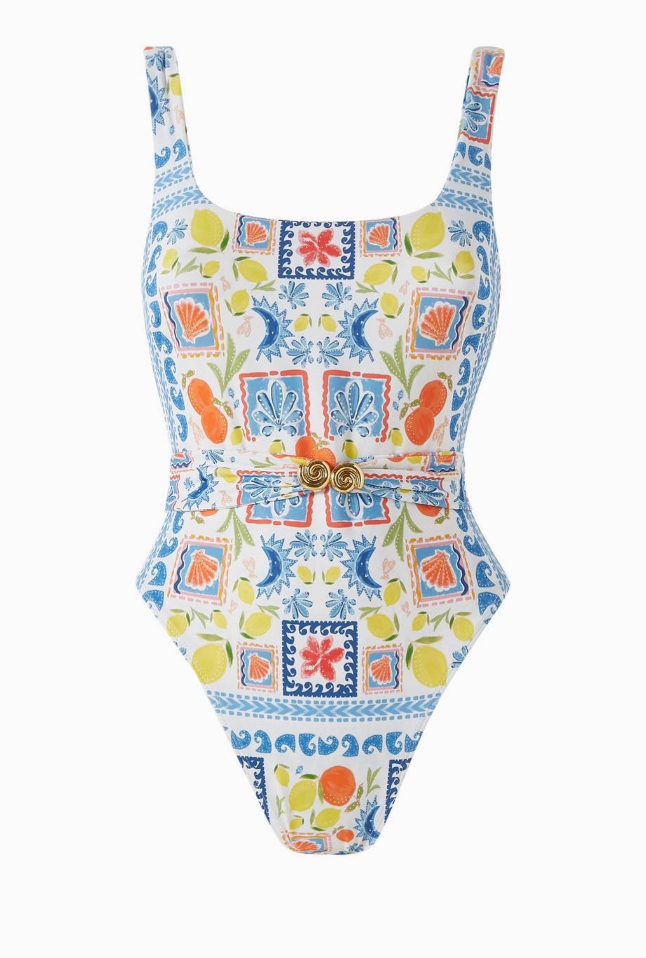Designed for its elegance and crafted with vintage-inspired gold shell hardware - The Isola Bella one-piece is the ultimate classy statement. Featuring a flattering square cut neckline, low scoop back, and a seamless flattering cut, this design combines a timeless silhouette with a removable gold shell belt.