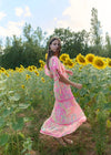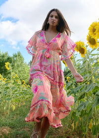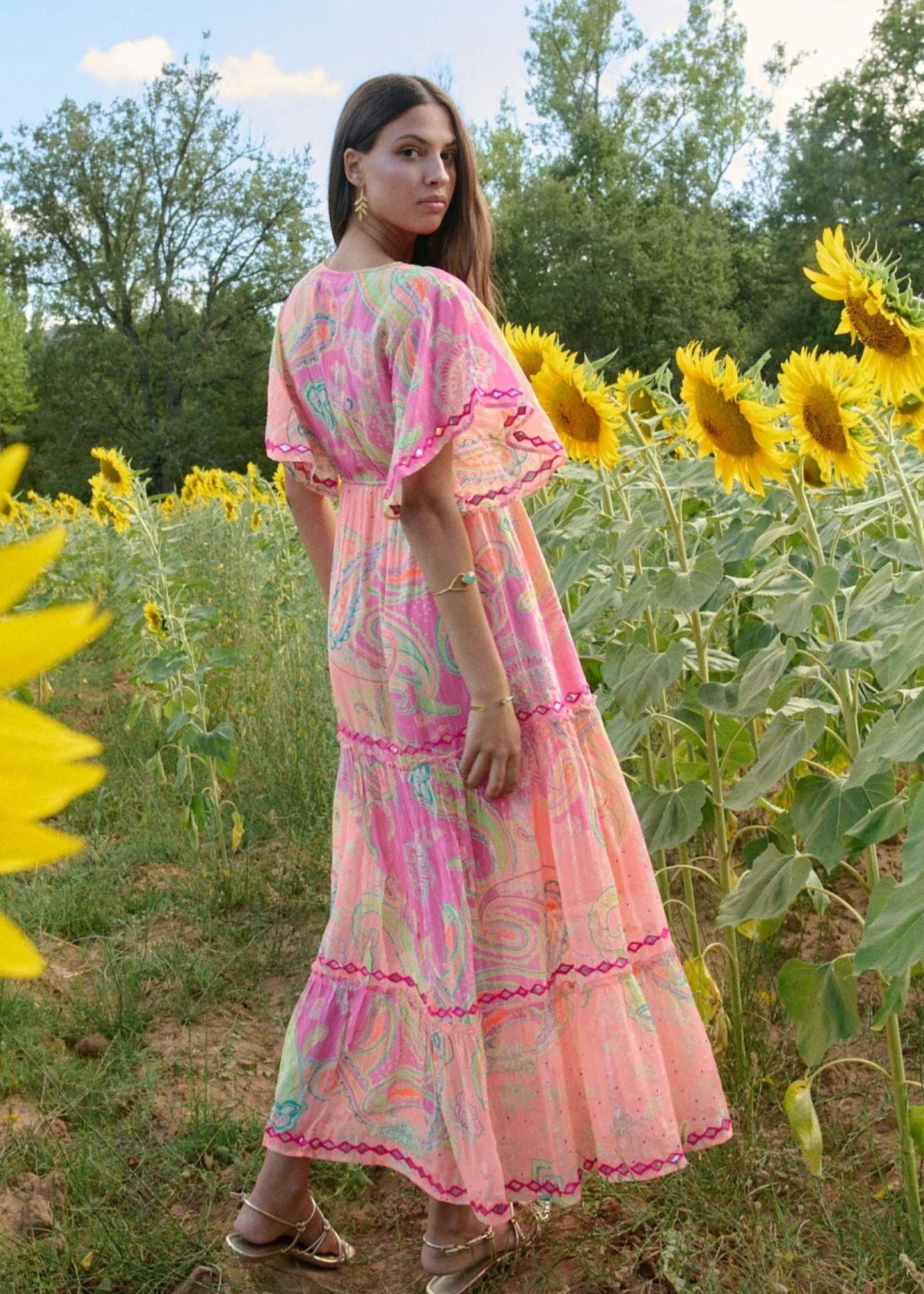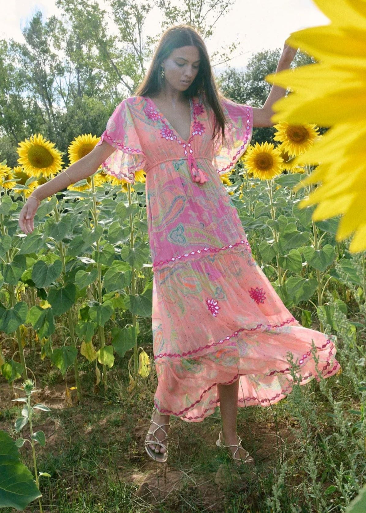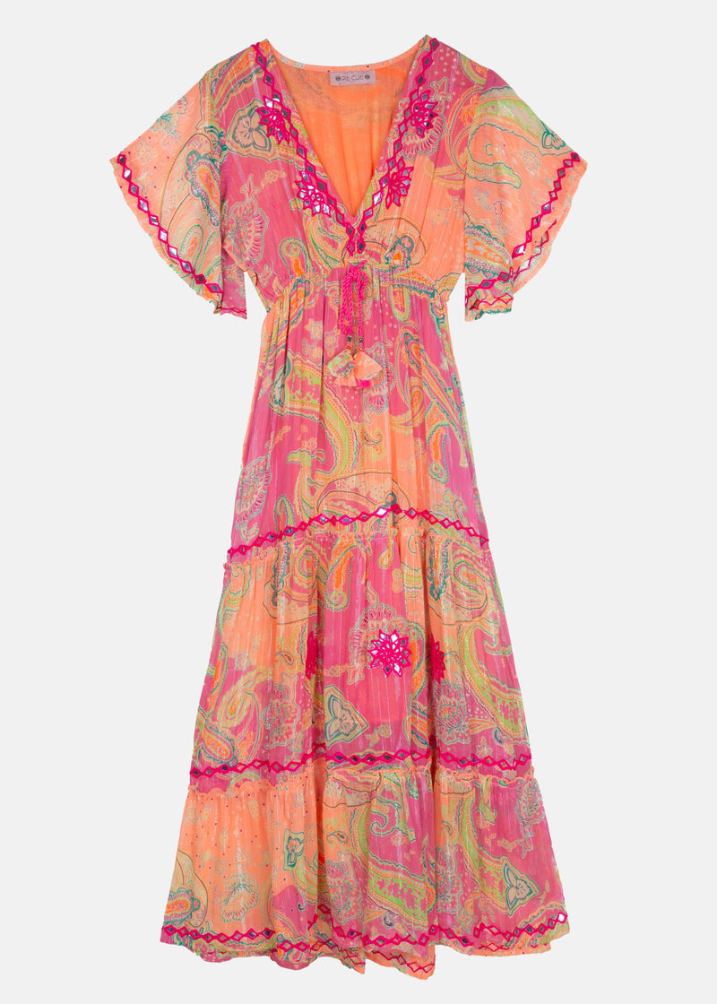 This viscose chiffon dress full of embroidered details and mirrors is perfect for any outing this summer.