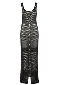 Glamorous and chic! This Seychelles Dress will make you feel like a star. Made in a luxury crochet knit, this elegant dress with curve neckline, gold button detailing and high front slits will make you brighten up any room you walk in. Paired with any of your swim, this dress will elevate any beach look!