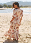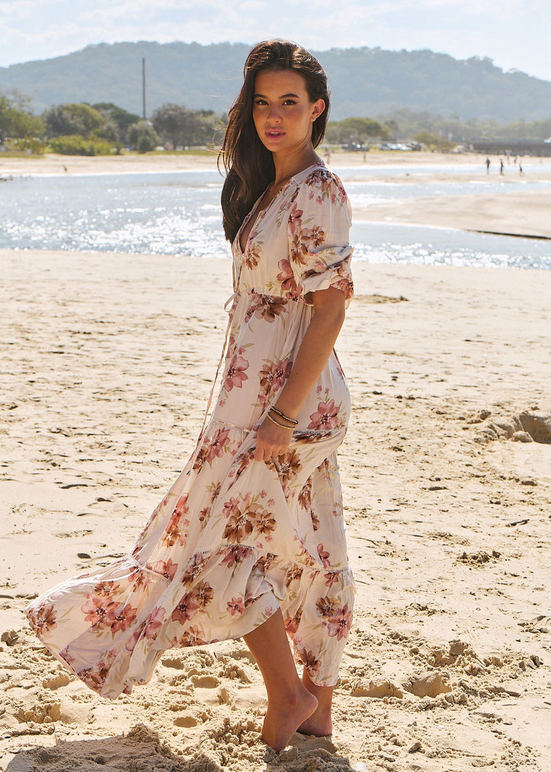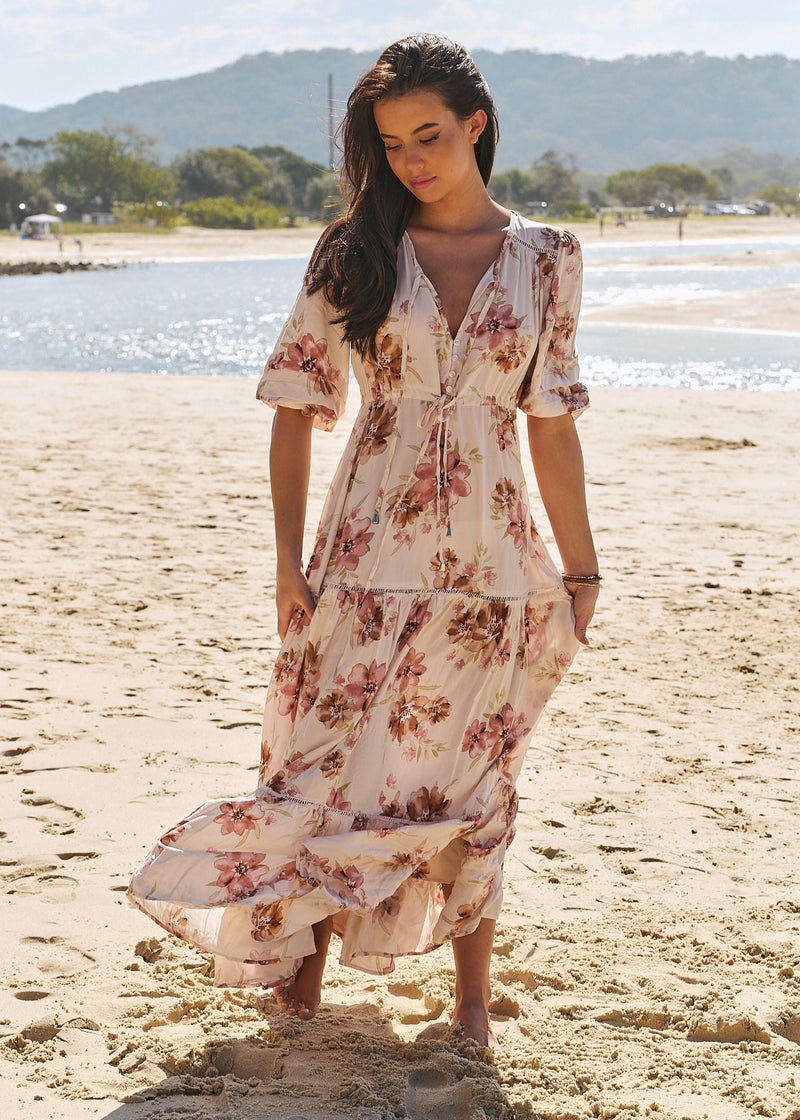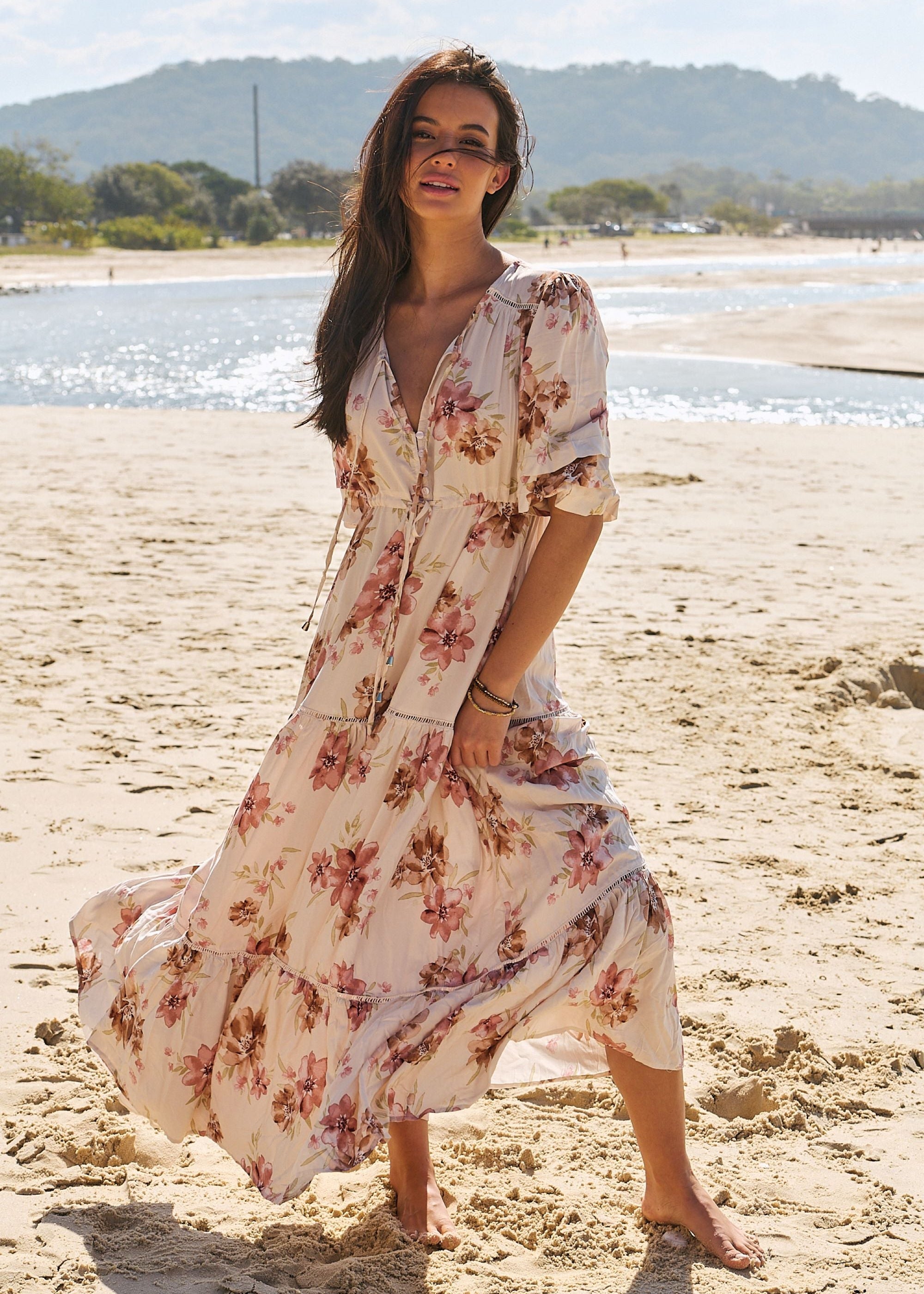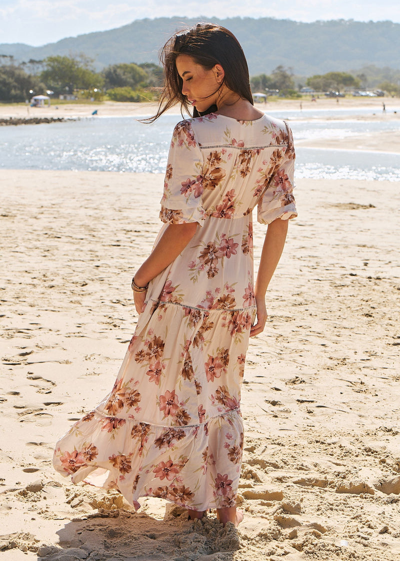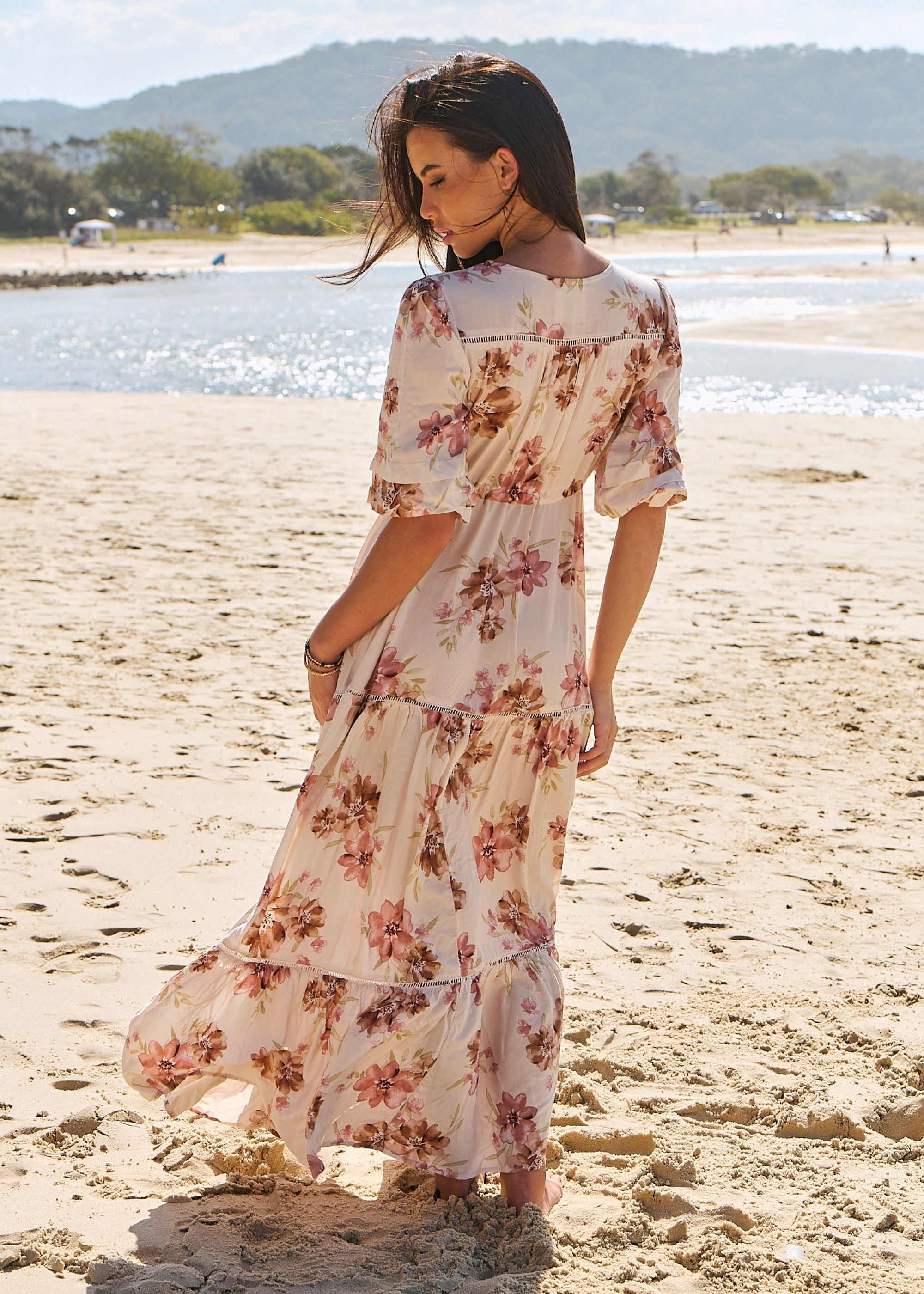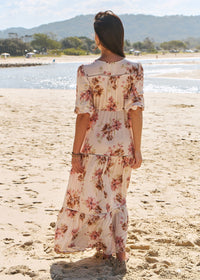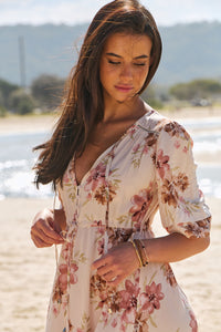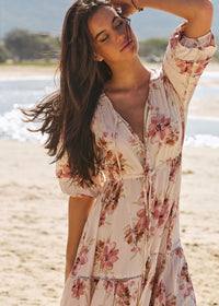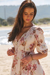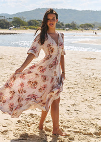 Jaase Mariana Dress in Love Story Print. So romantic, this stunning midi dress is featured in a three quarter sleeved silhouette with a triple pleating detail with lace trim across shoulder.