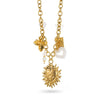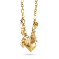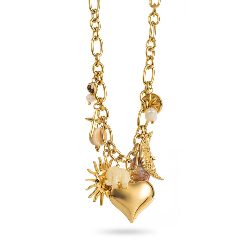 A chain short necklace, adorned with mini charms, ideal for layering.