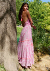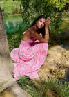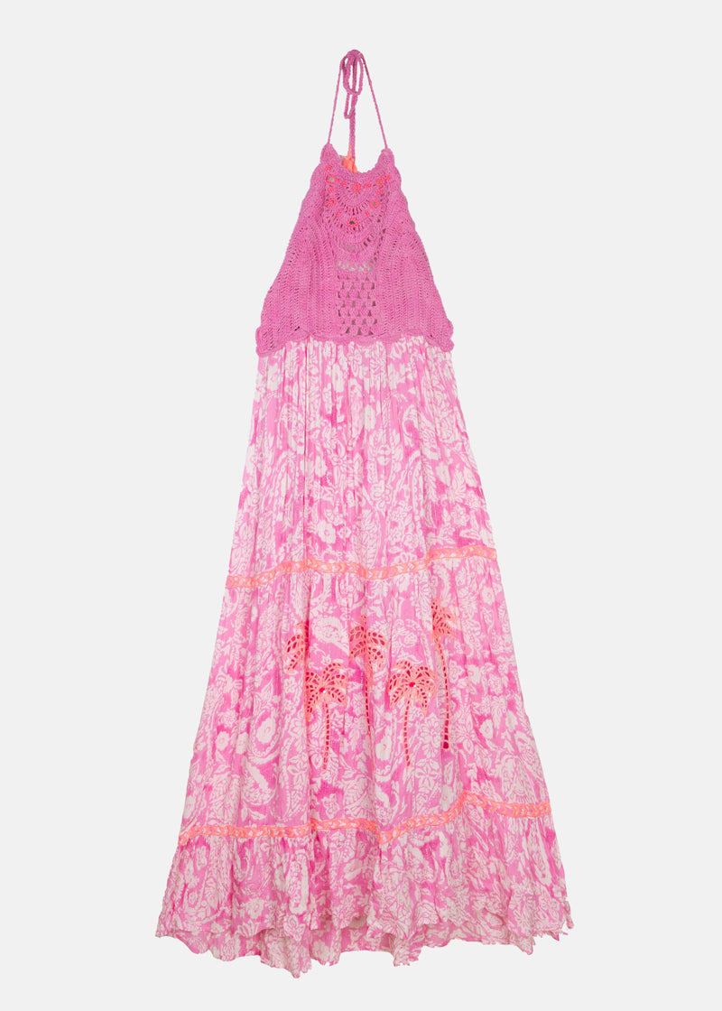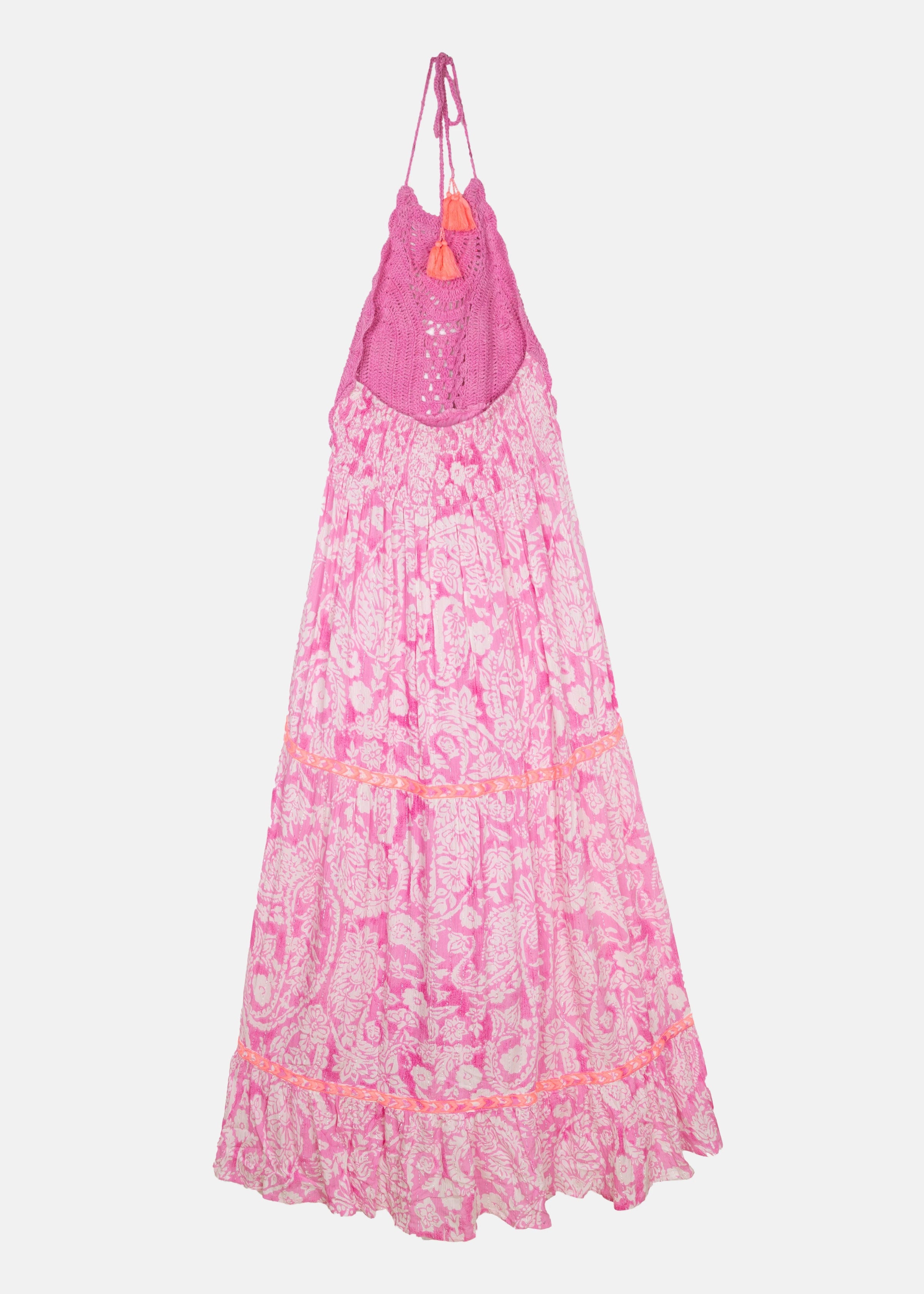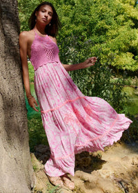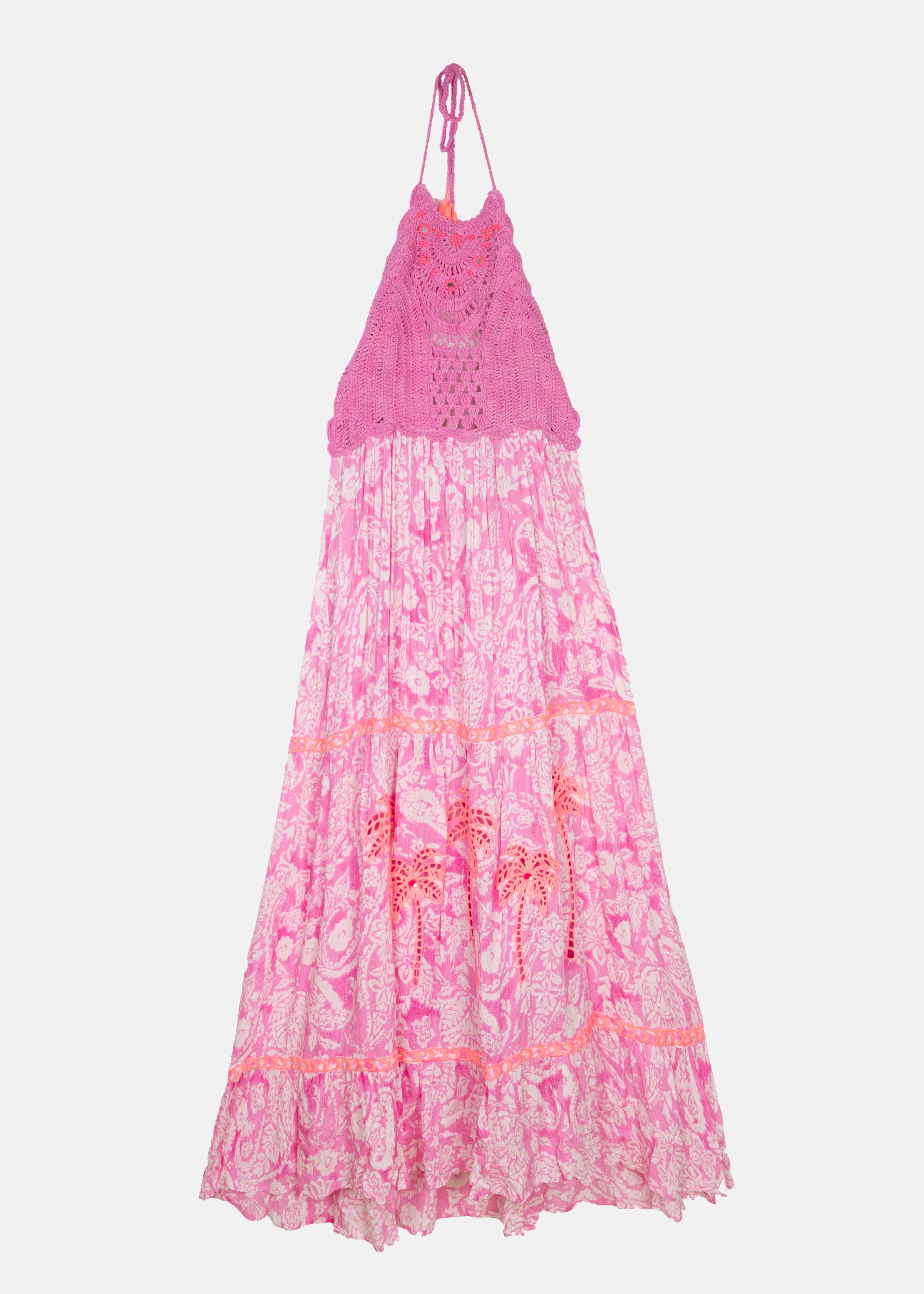 The long "Sahara Rosa" crochet dress stands out for its elegant design in a vibrant pink tone.