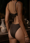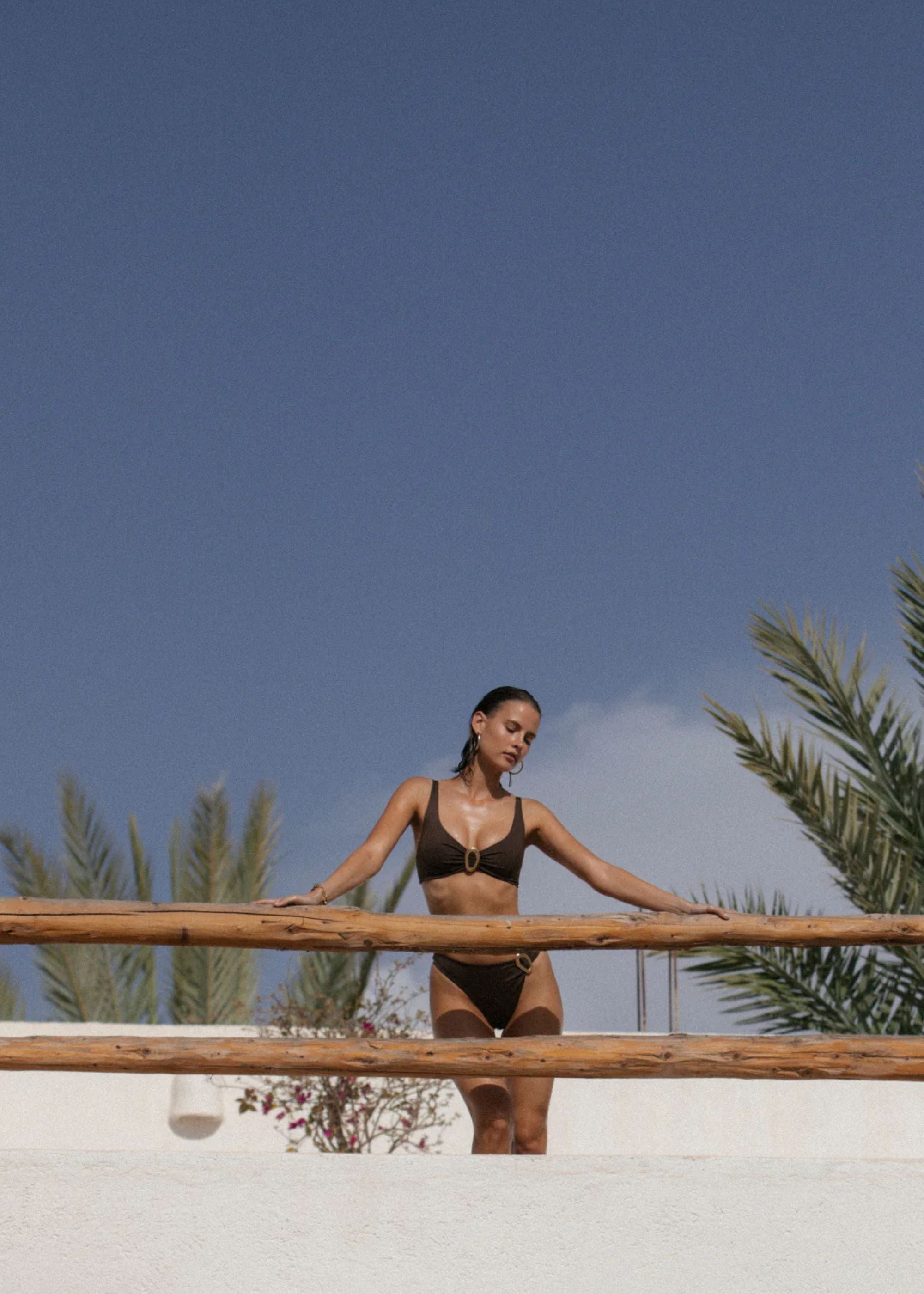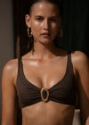 Elevate your holiday wardrobe with this elegant, sculpted bikini top, designed with a flattering scoop neckline and bold, vintage-inspired gold centre ring. Minimalist yet striking, this top is perfect for sun-drenched days and sunset lounging, providing ultimate comfort and support without any underwire or padding. Complete with adjustable straps and a tie-back for full adjustability.