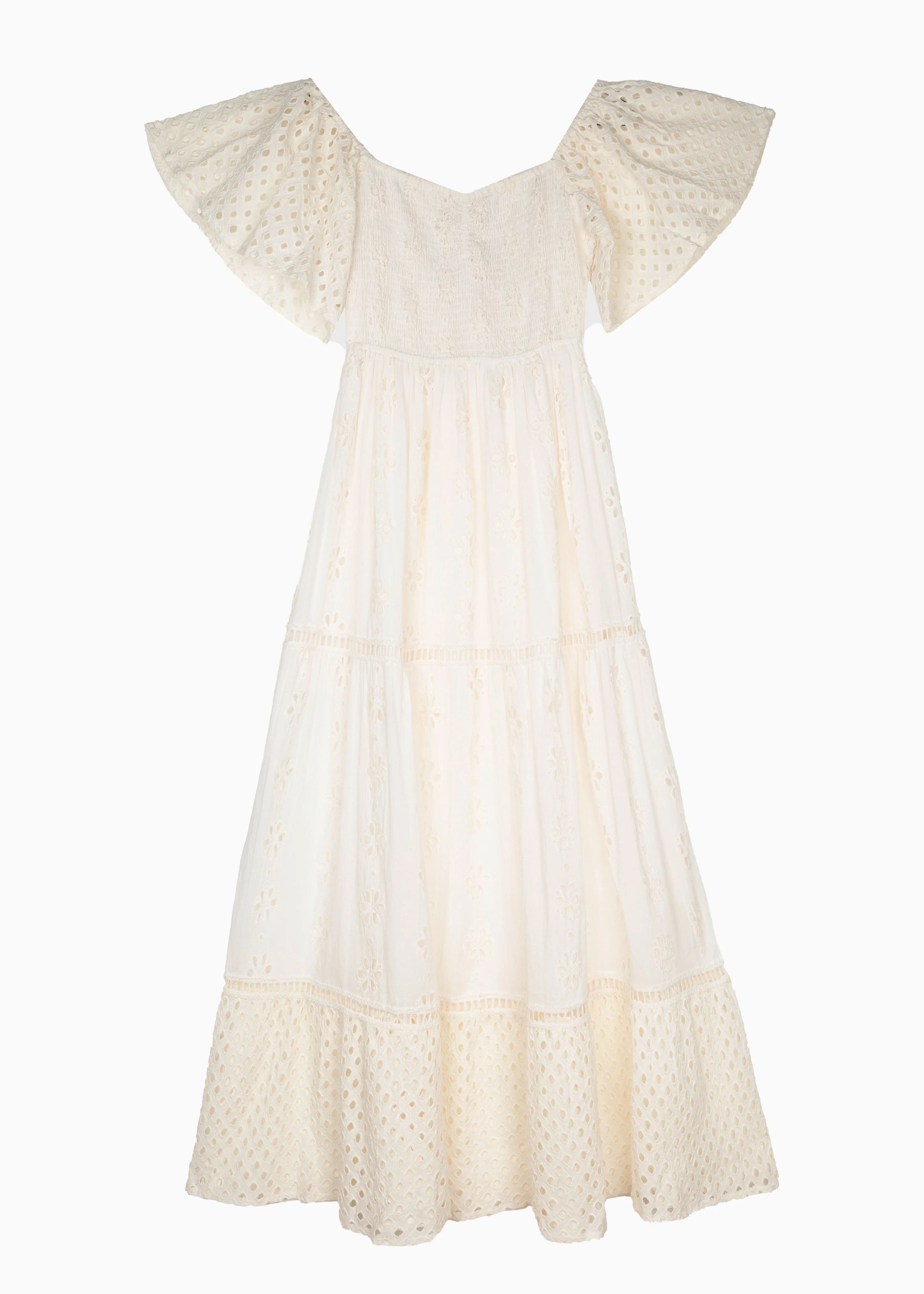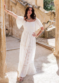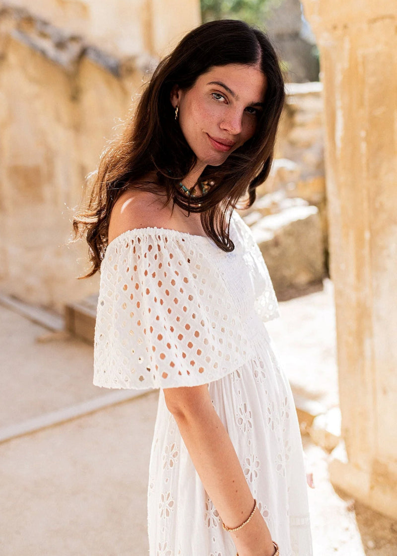 The "Sicilia’ maxi dress stands out for its elegance in a pure white tone. With a flowing drape and sophisticated design.