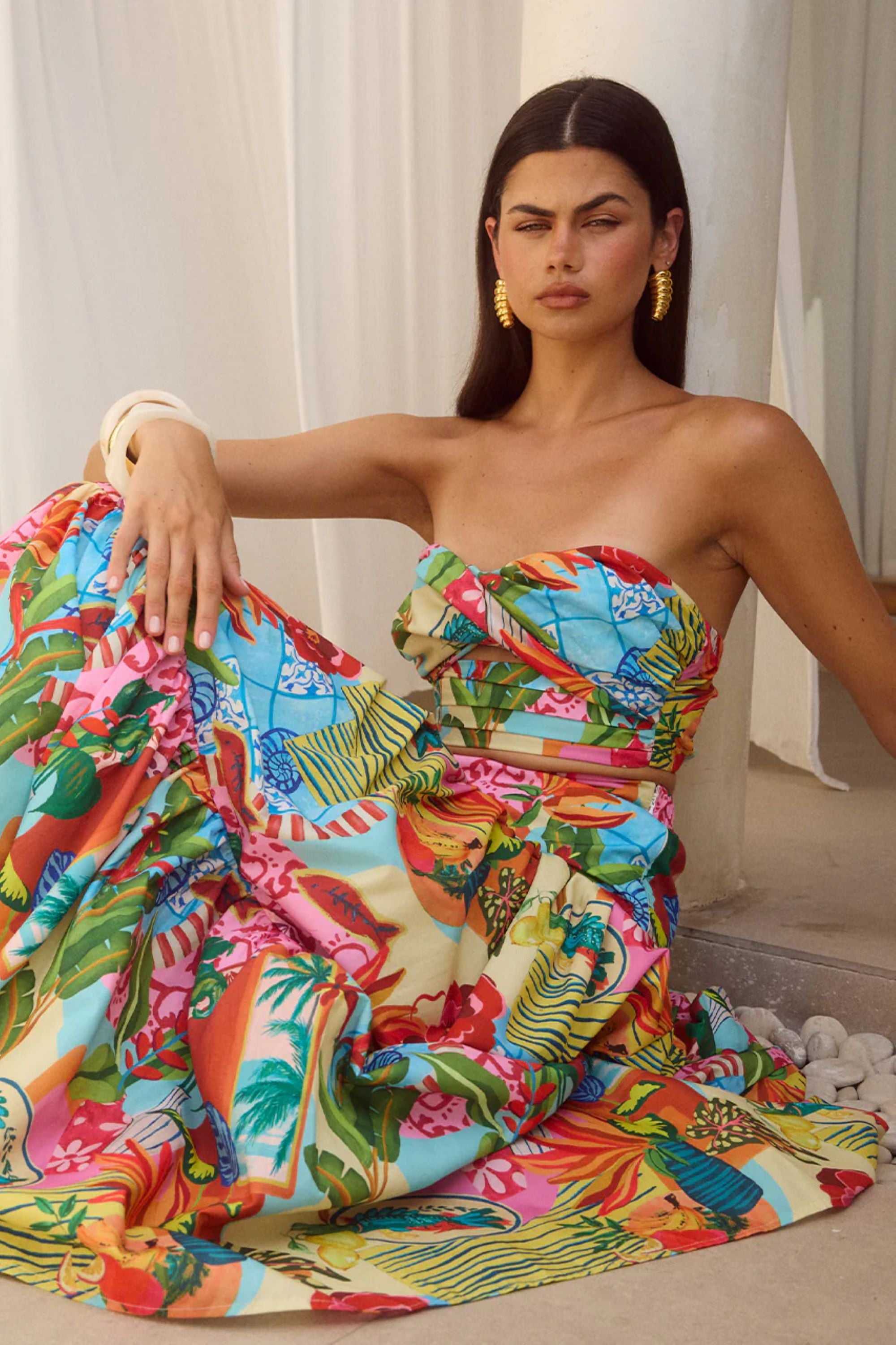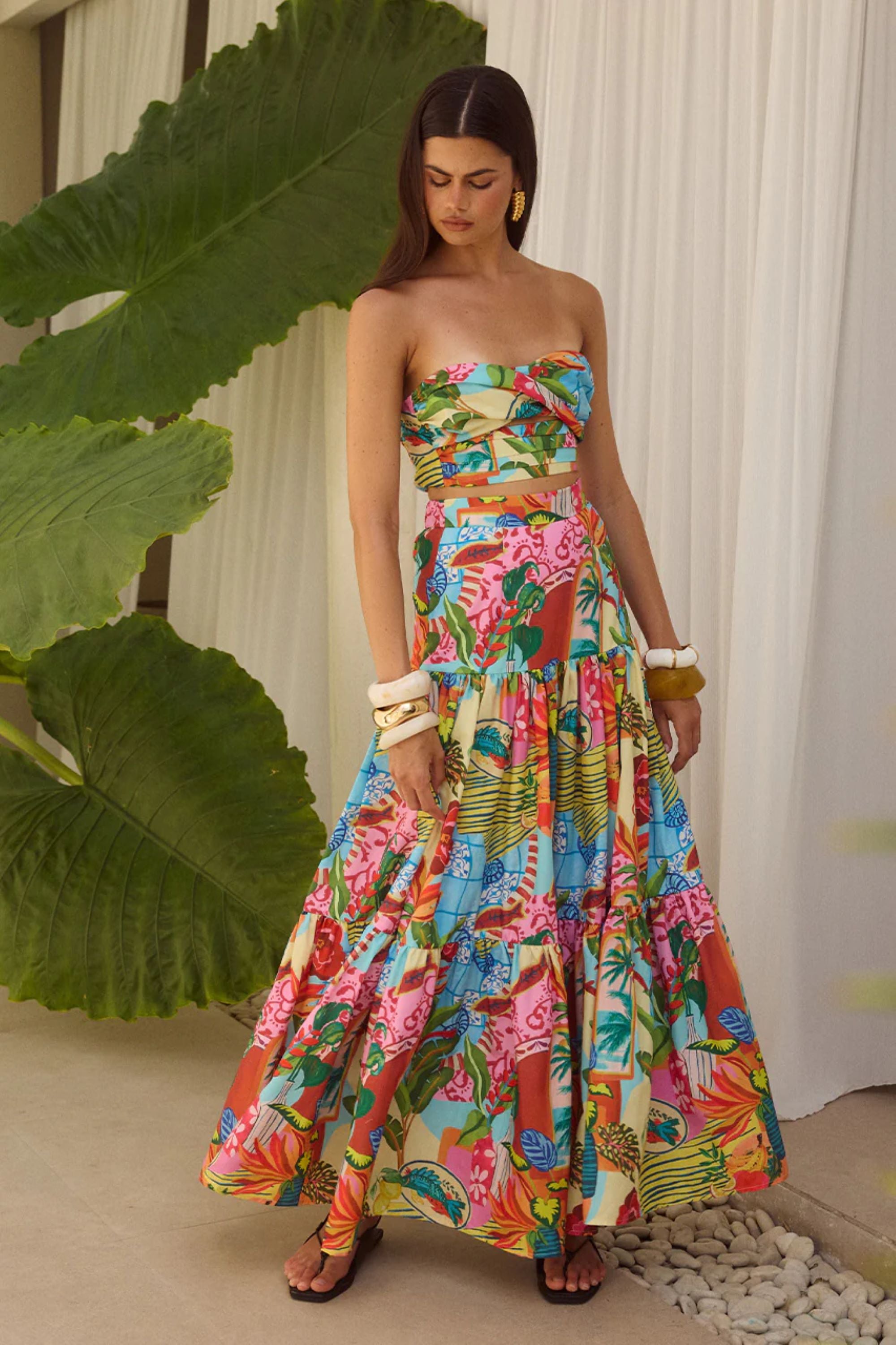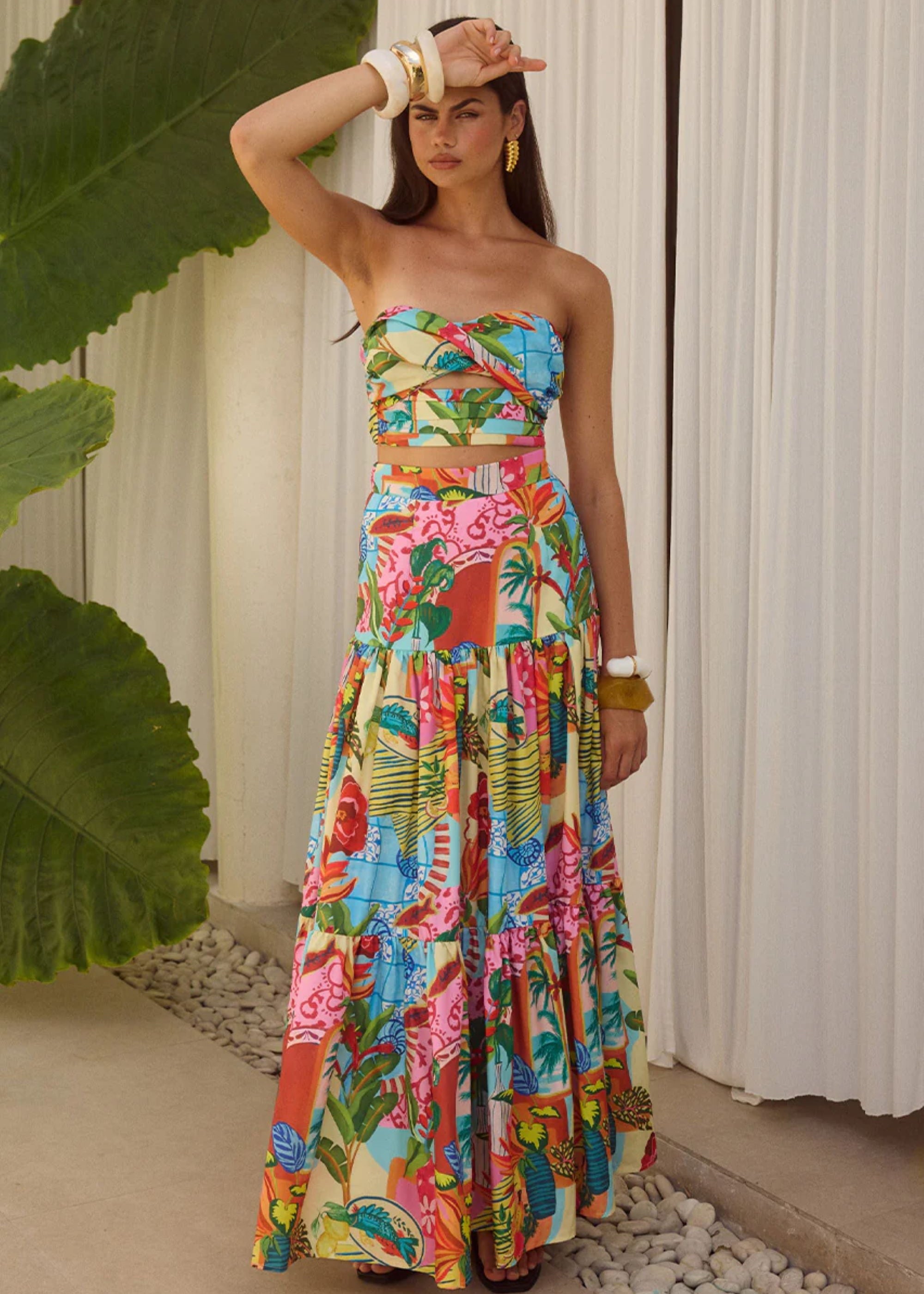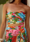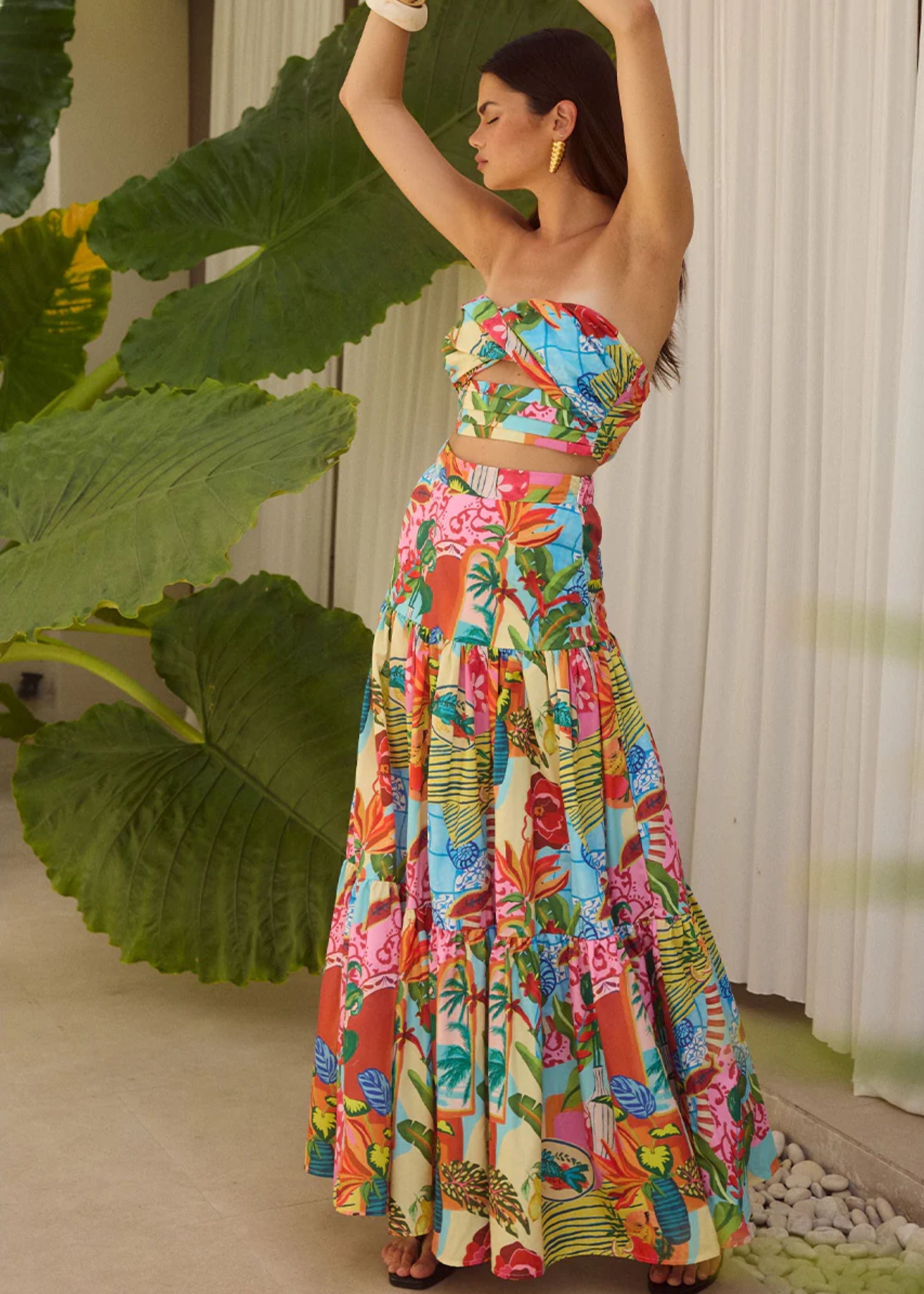 Top features a cropped cut, twisted detailing on the bust, a fitted bodice with shirring at the back and a double layer of body fabric.